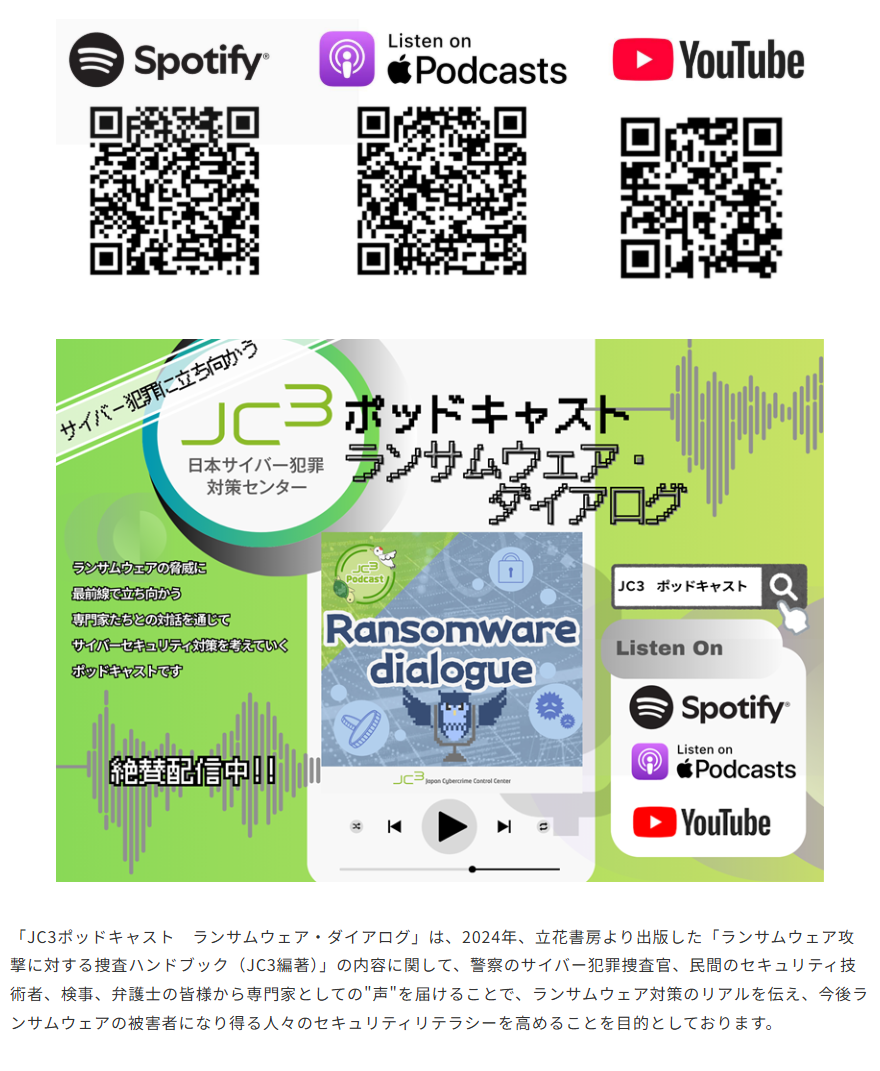 ランサムウェアの脅威に最前線で立ち向かう専門家たちとの対話を通じて、サイバーセキュリティ対策を考えていく「JC3ポッドキャスト ランサムウェア・ダイアログ」を2025年12月8日より配信開始いたしました。