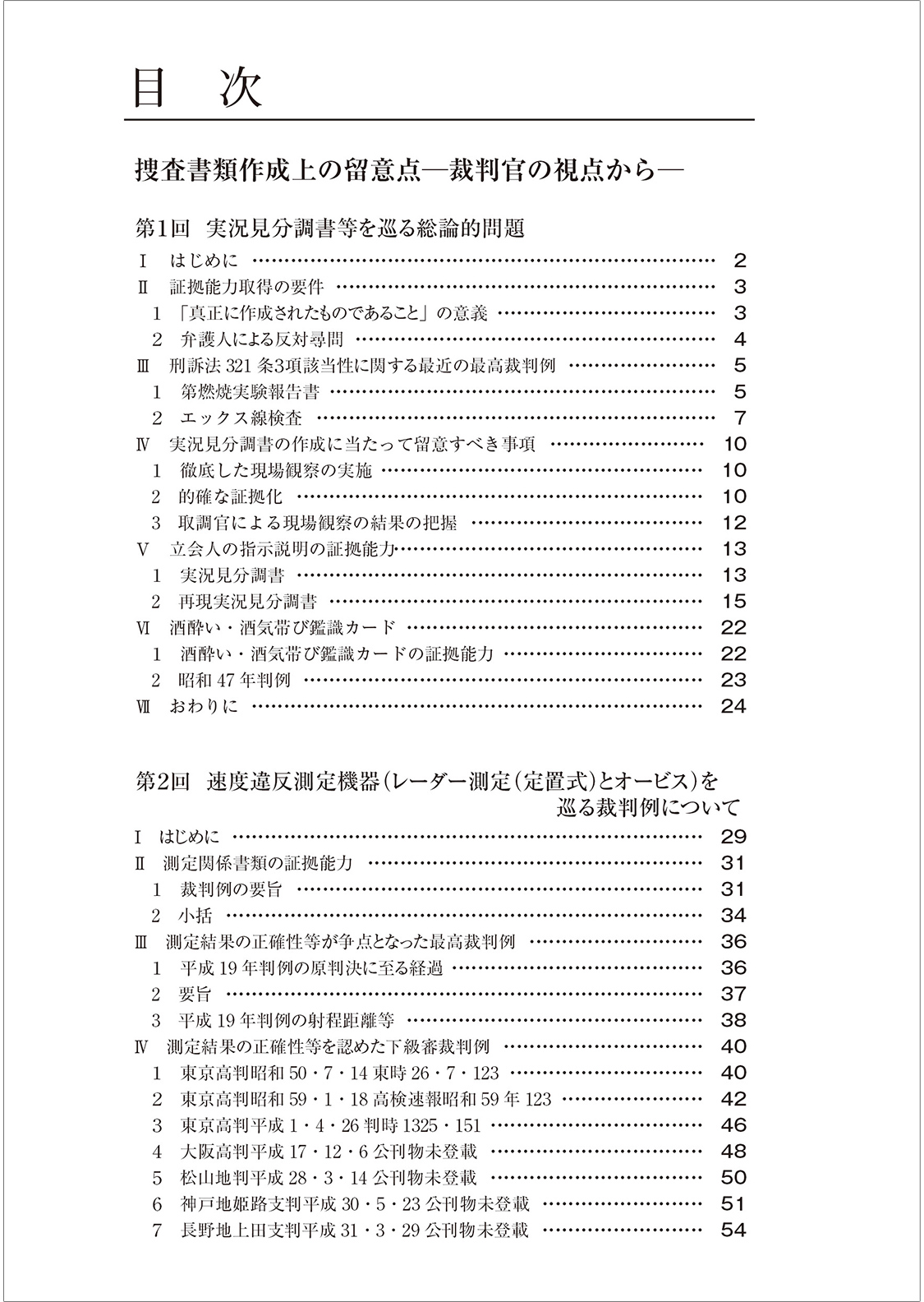本書は、各種捜査書類の中から、実況見分調書や速度測定関係書類を取り上げ、その証明力等に関する判例、最近の東京高裁の裁判例を紹介しながら、判断者である裁判官の視点から警察実務面での検討等を加えたものである。